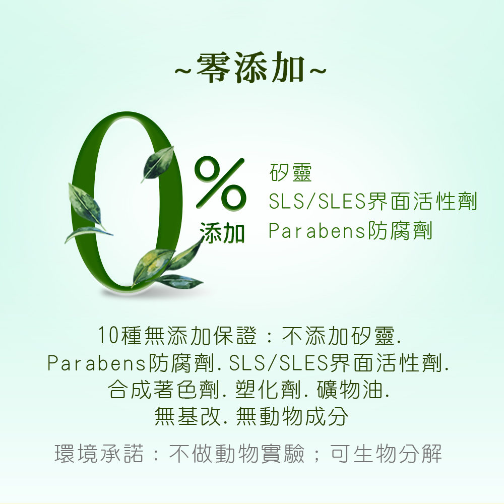 不添加矽靈、SLS/SLES界面活性劑、parabens防腐劑、化學香精、著色劑、塑化劑、礦物油等。