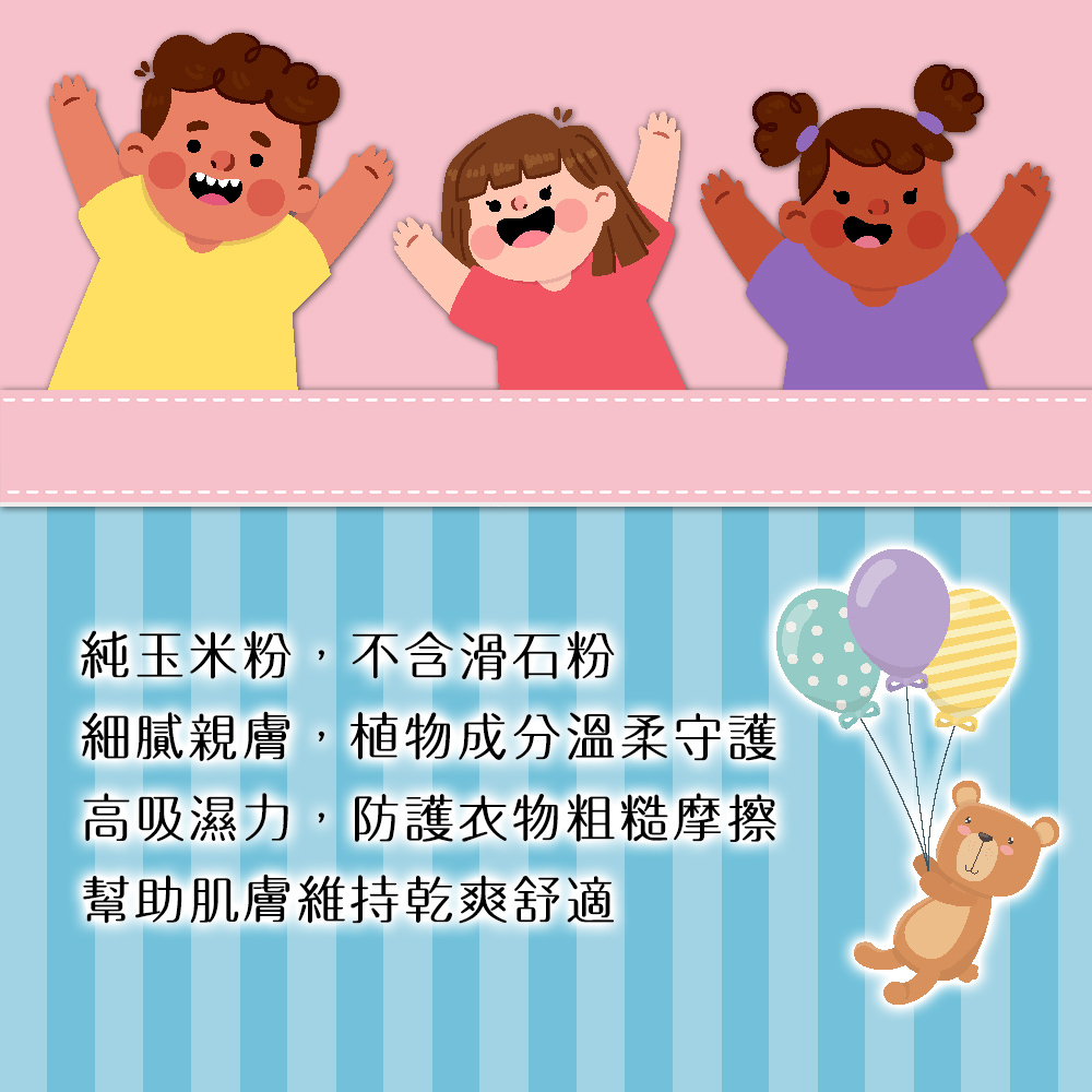 純玉米粉,不含滑石粉,細膩親膚,植物成分溫柔守護