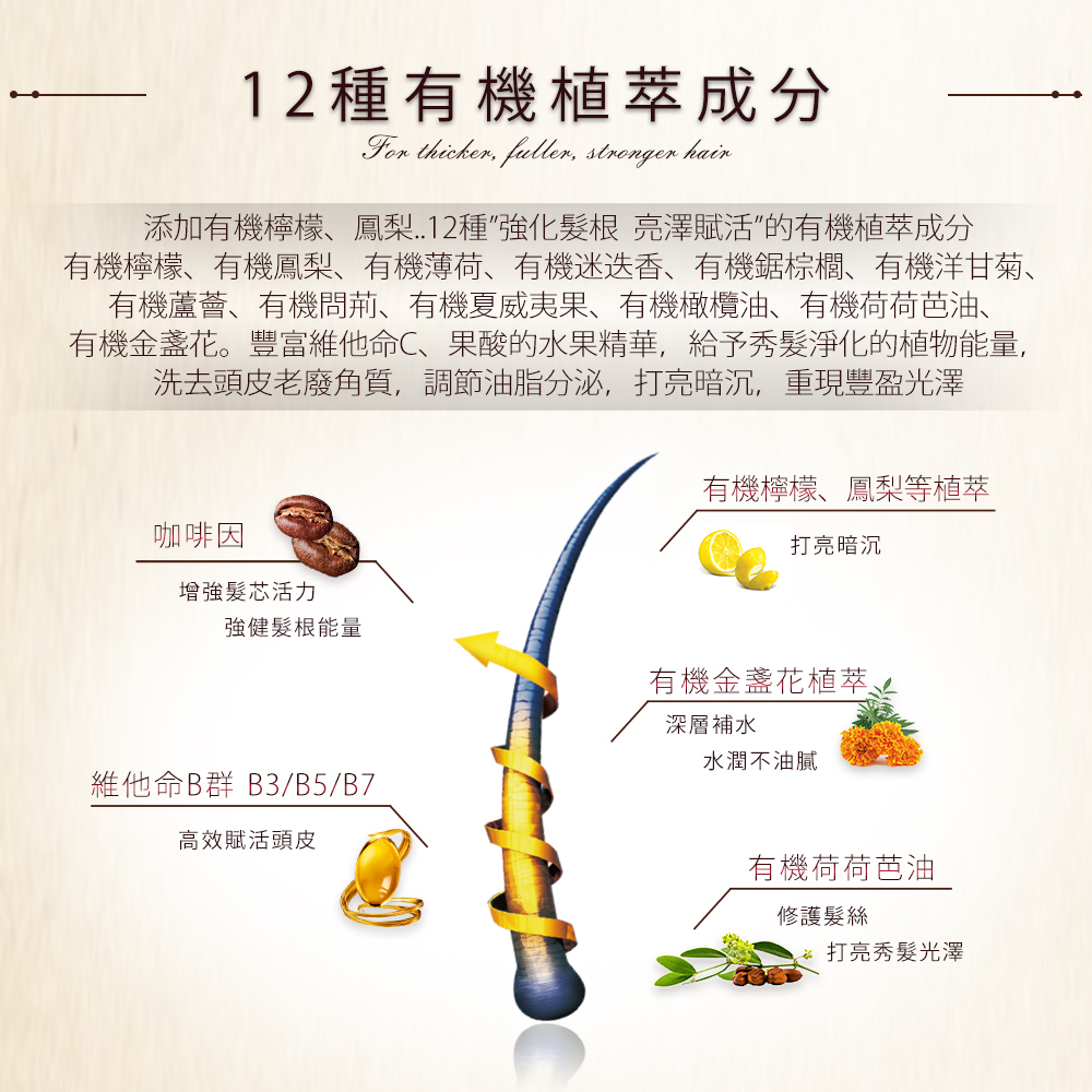 ☆含12種有機認證成份 Organics 有機檸檬、鳳梨,能打亮暗沉秀髮,重現豐盈光澤