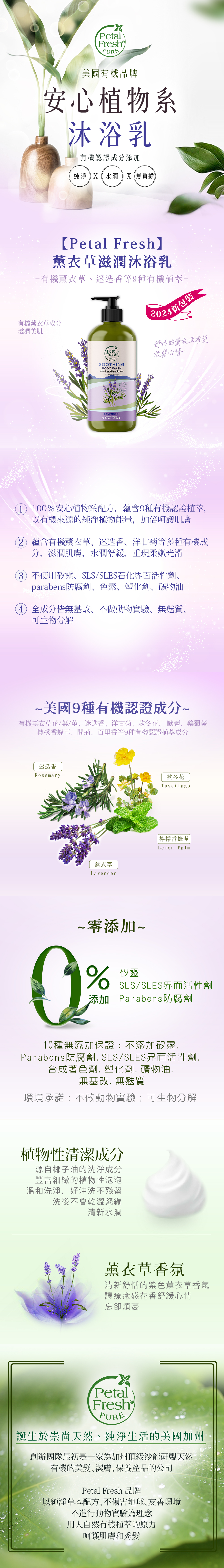☆有機草本配方,添加薰衣草、洋甘菊、迷迭香等9種有機植萃,滋潤美肌,柔嫩光滑,重現健康光澤