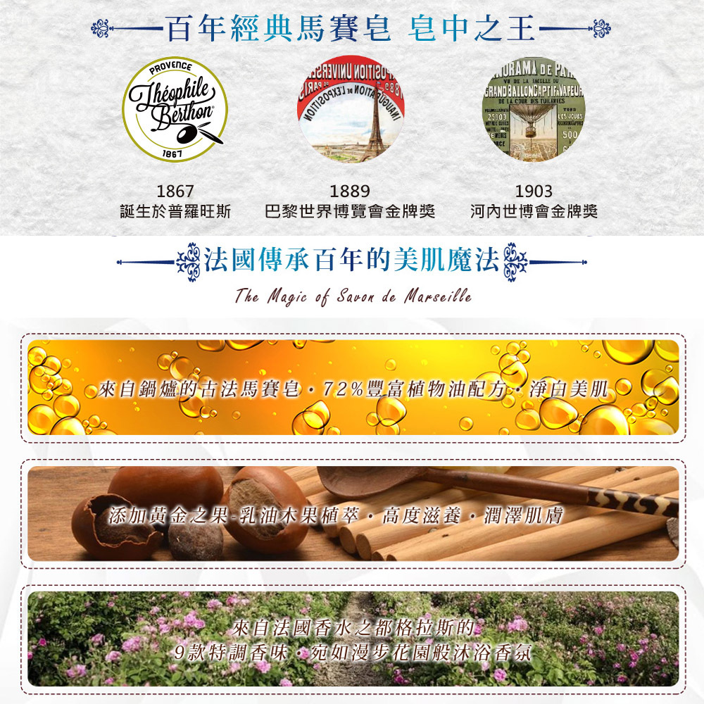 法國百年皂廠,72%植物油經典配方,添加乳油木果成分,美肌呵護。