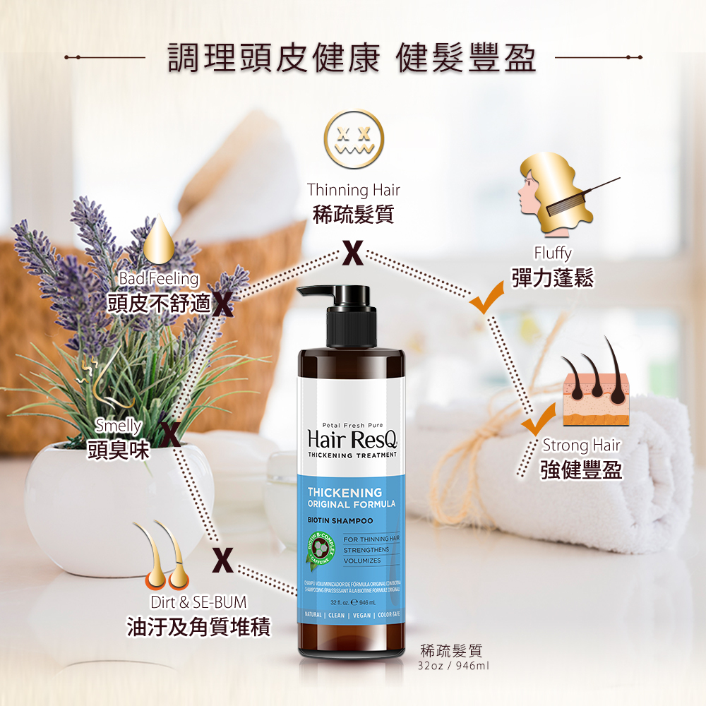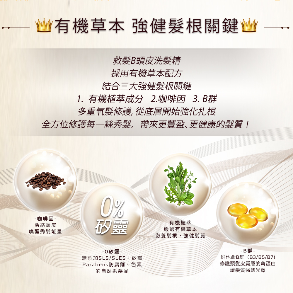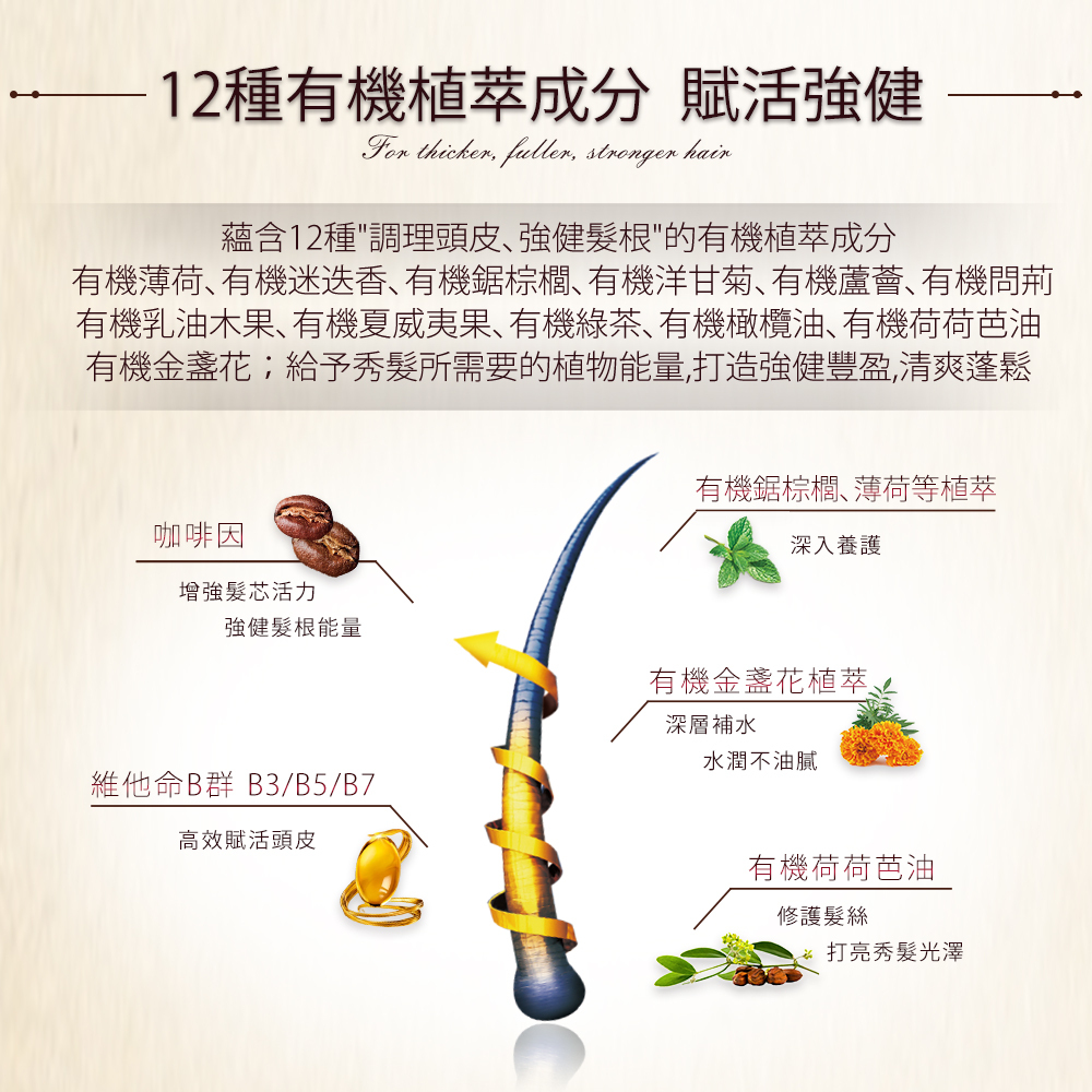全能健髮配方,結合強健髮根關鍵成分:B群、咖啡因、有機植萃
