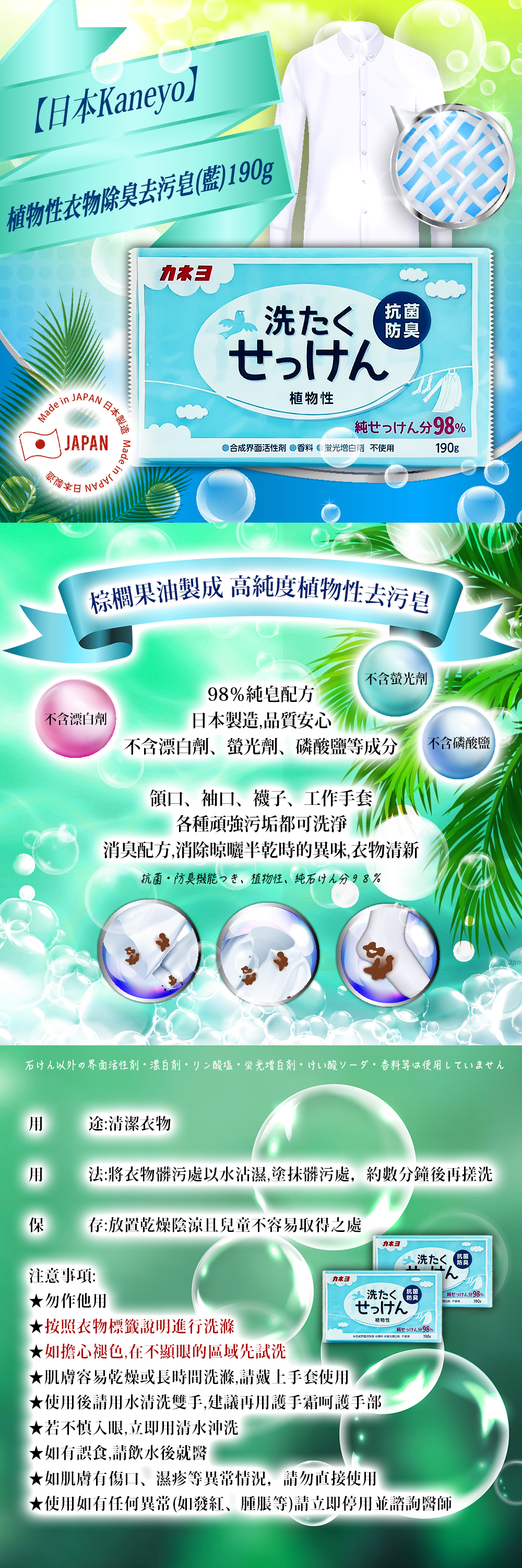 •98%純皂配方,不含漂白劑、螢光劑、磷酸鹽等成分。
