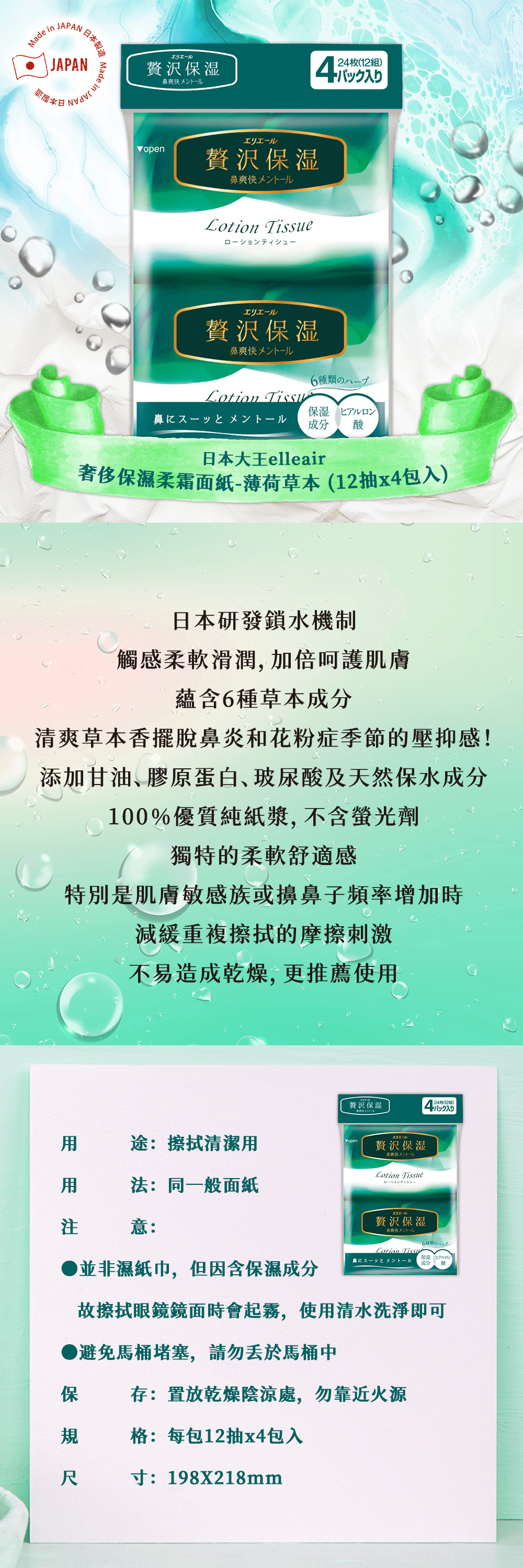 ♦日本研發鎖水機制,觸感柔軟滑潤,加倍呵護肌膚,蘊含6種草本成分,清爽草本香擺脫鼻炎和花粉症季節的壓抑感!